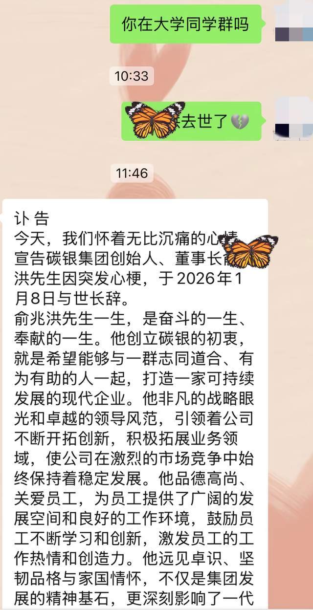 1月15号,有一位来自广东的网友发文悼念好友,并在留言处透露,两人是大学时期的好朋友,但毕业之后就断了联系,没想到再一次听闻消息居然是其去了另外一个世界,由此导致其心绪难过与感慨。从其分享的讣告内容中可以发现,他的好朋友是碳银集团的创始人也是董事长,虽然名字被打码,但根据某科的资料可以得知,对方名叫俞兆洪,出生于78年,也就是说去世的时候才48岁。随后,有知...